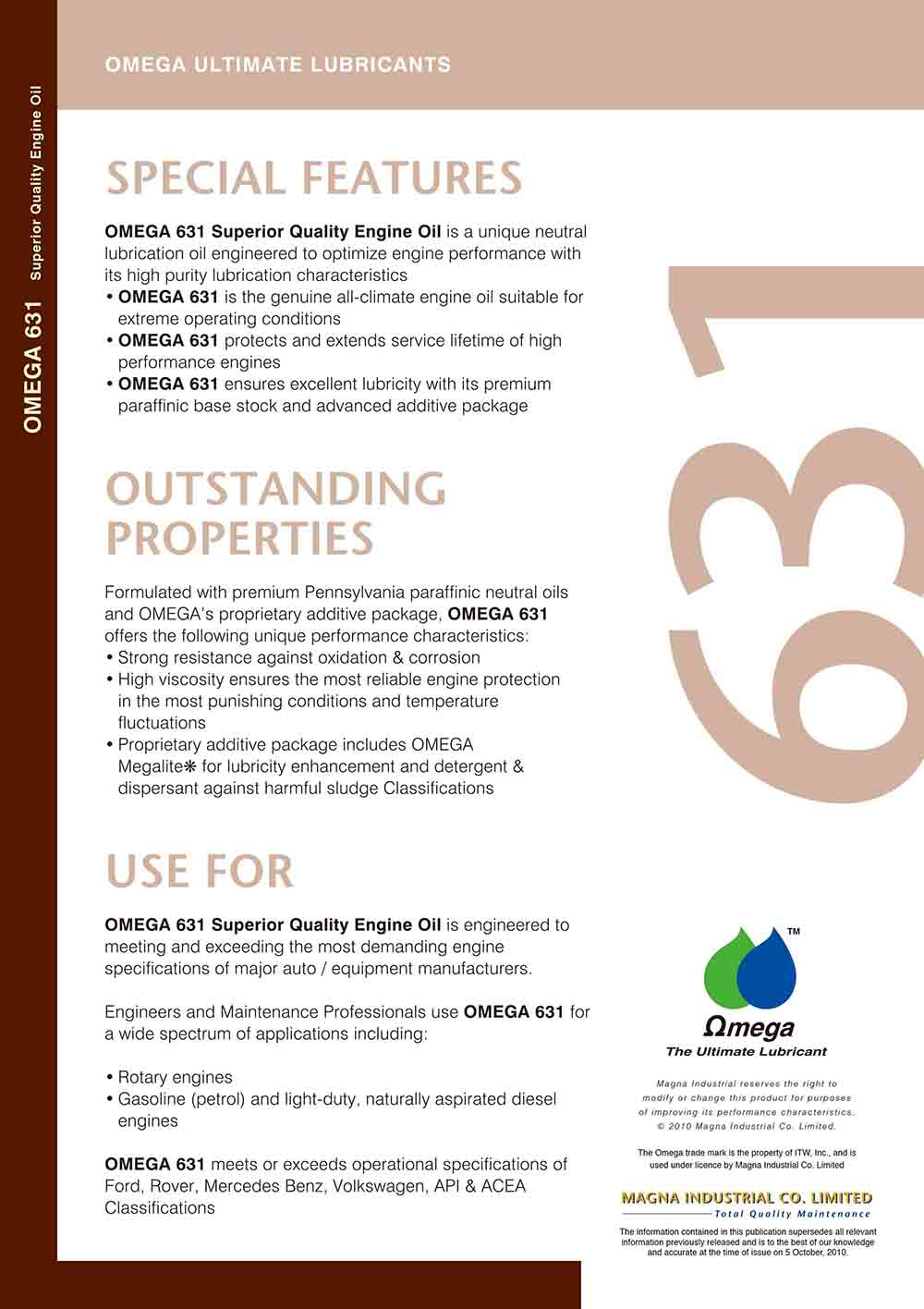 Omega 631 น้ำมันเครื่องคุณภาพสูงที่ผลิตจากฐานน้ำมันพาราพินเพ็นซิวาเนีย 100 % ยอดเยื่ยมด้วยประสิทธิภาพเครื่องยนต์ที่มีลักษณะของความบริสุทธิ์หล่อลื่น ขั้นสูงจากไขพาราฟินสำหรับเครื่องยนรอบจัด สามารถใช้ได้กับเครื่องยนต์ โรตารี่ และเครื่องยนต์ทุกชนิดรวมถึงเครื่องยนต์ปรับแต่งทุกประเภท