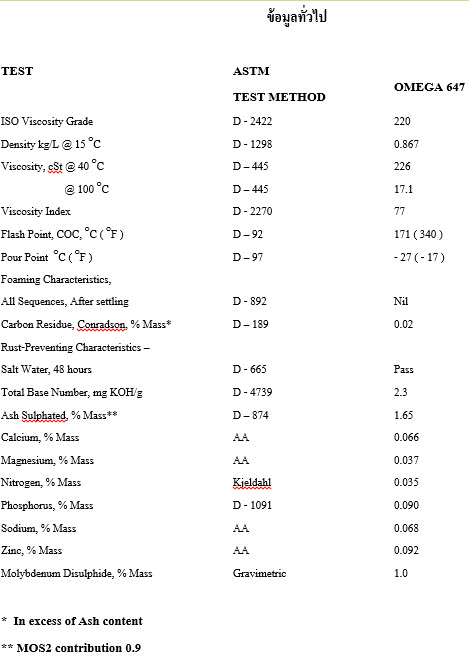 คุณสมบัติโดยทั่วไปของน้ำมันหล่อลื่นโซ่ OMEGA 647 ใช้งานวิศวกรรมสำหรับ การหล่อลื่นที่มีสมรรถนะสูง