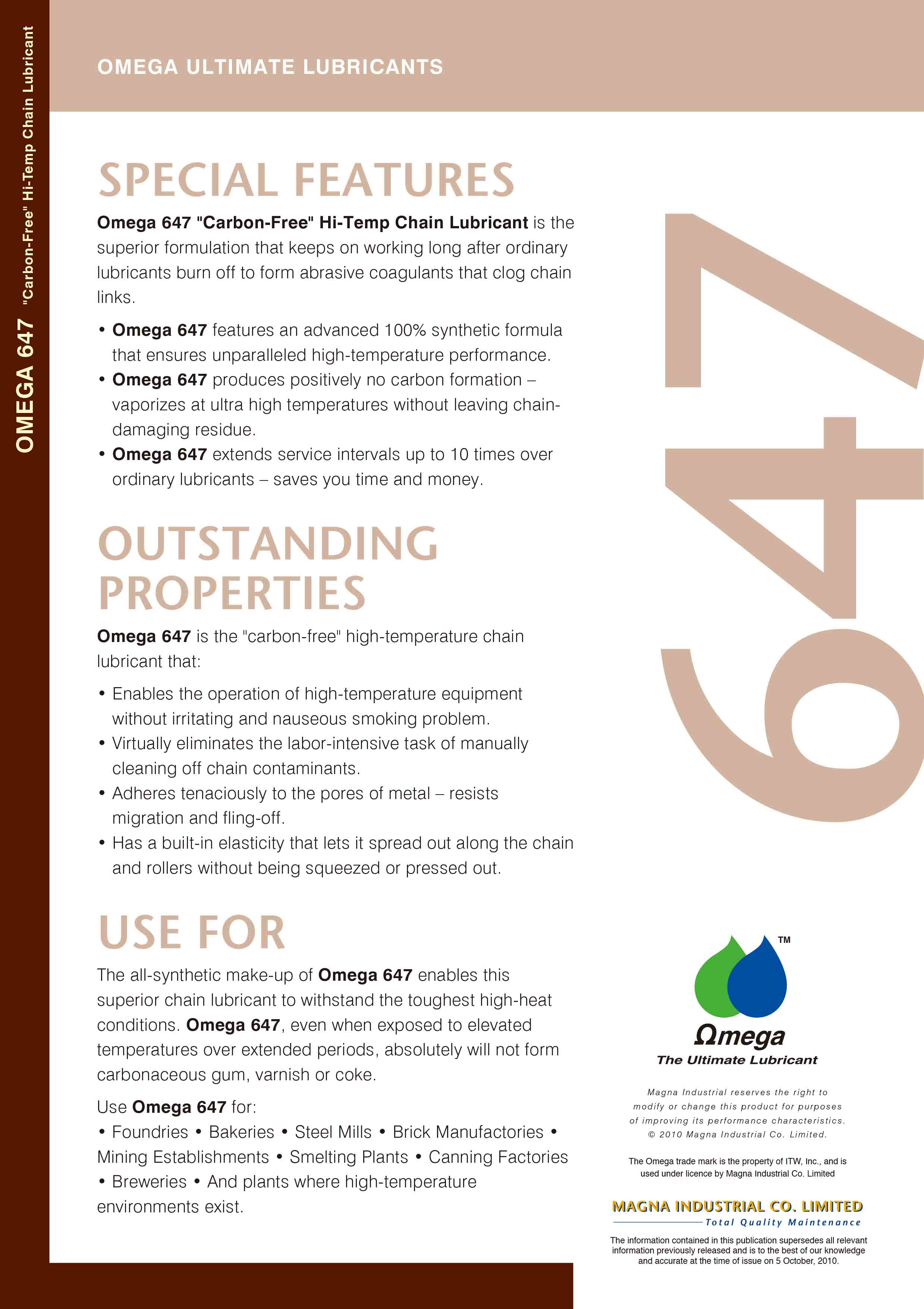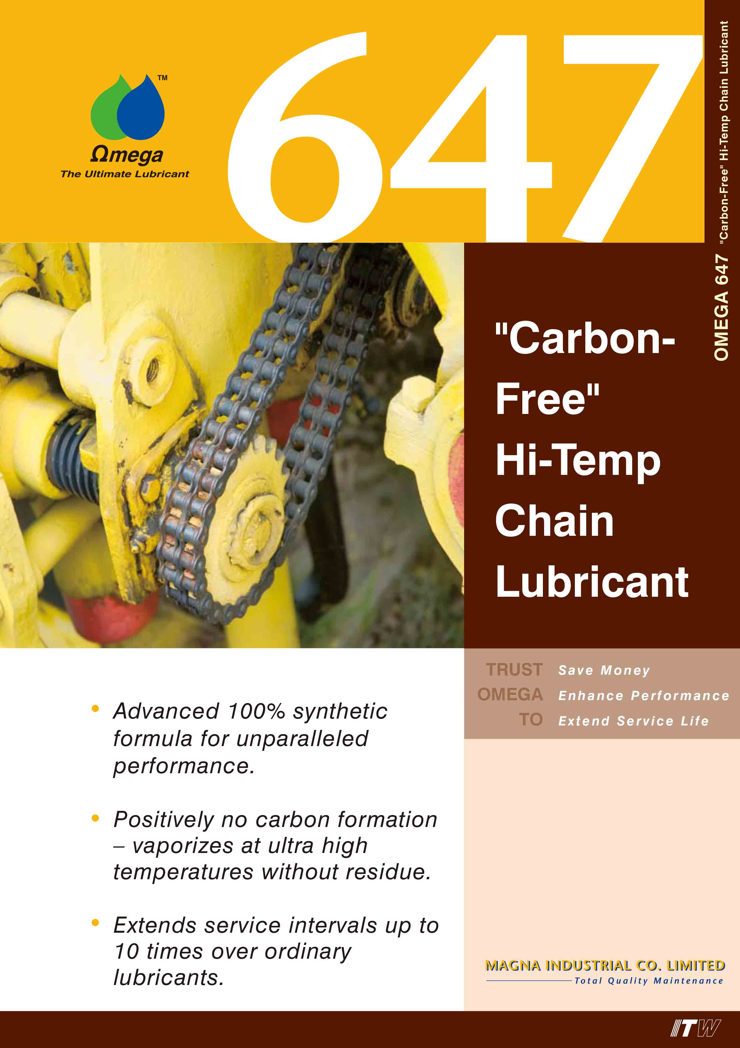 OMEGA  647"Carbon-Free" Hi-Temp Chain Lubricant น้ำมันหล่อลื่น สำหรับโซ่ซินเธติก สูตรปราศจากควัน ที่ทนความร้อนสูง ถูกพัฒนาเพื่อการหล่อลื่นโซ่อย่างสมบูรณ์แบบเป็นและที่ยอมรับกันอย่างกว้างขวาง   “High tech” เหมาะสมสำหรับการหล่อลื่นโซ่ ใน สภาวะการใช้งานที่อุณหภูมิสูงกว่าผลิตภัณฑ์หล่อลื่นโซ่ ที่ทำมาจากน้ำมันหล่อลื่นพื้นฐานซึ่งประกอบด้วยแร่ทั่วไป(ISOVG 220)
