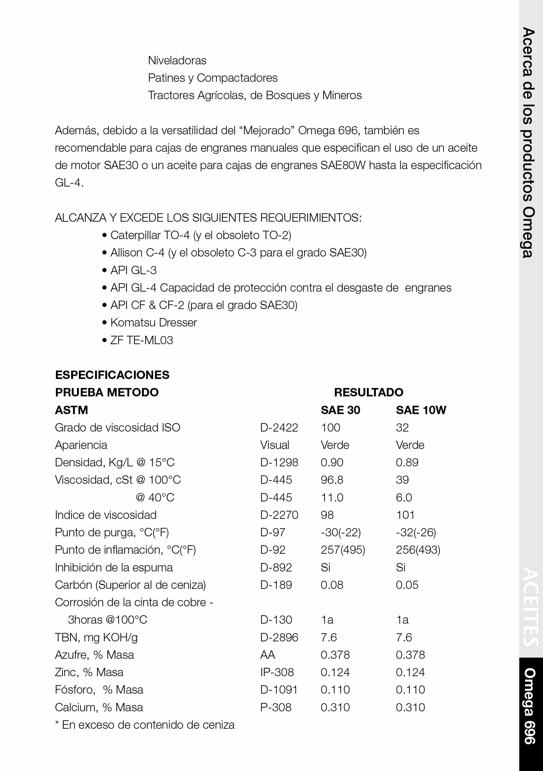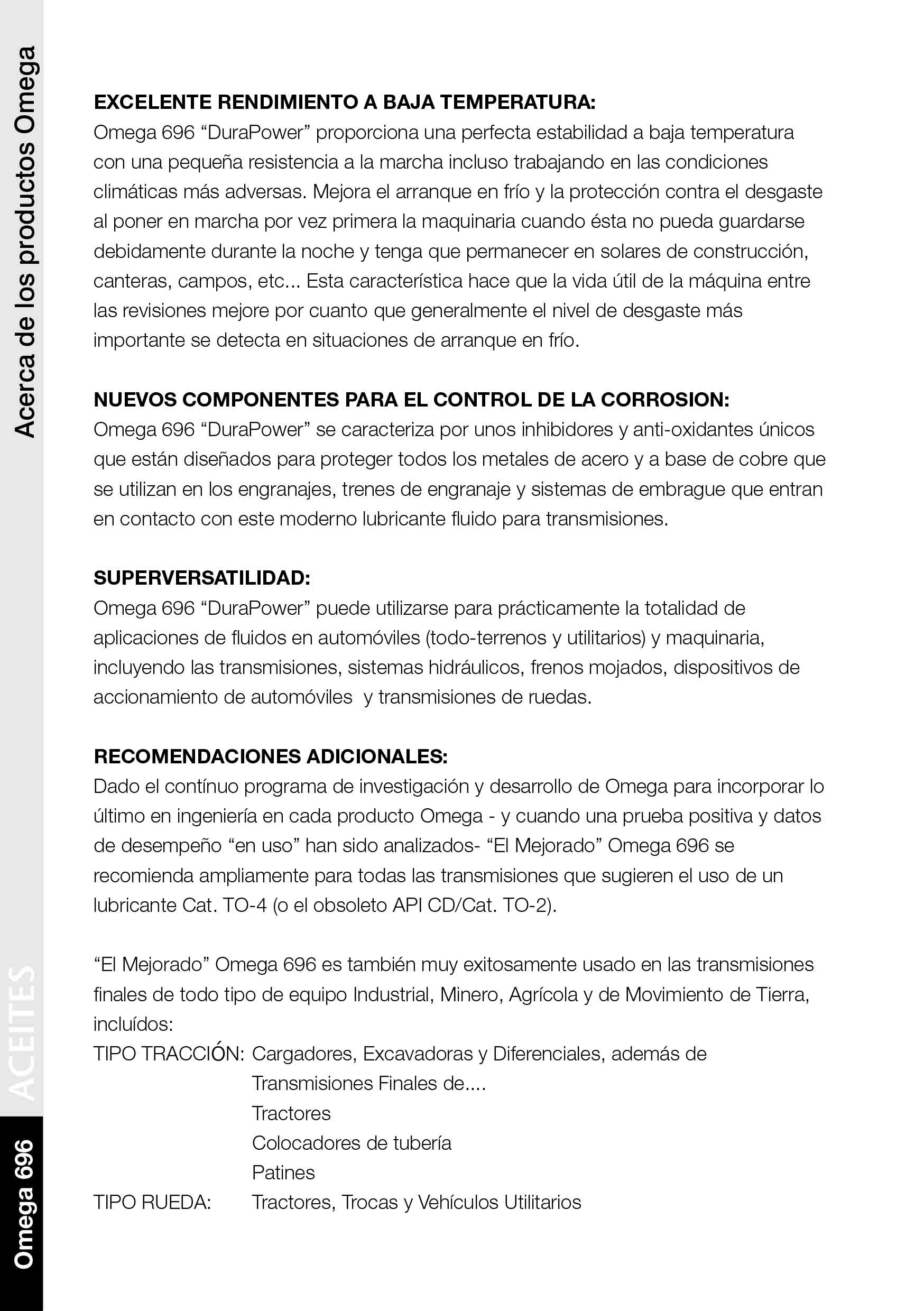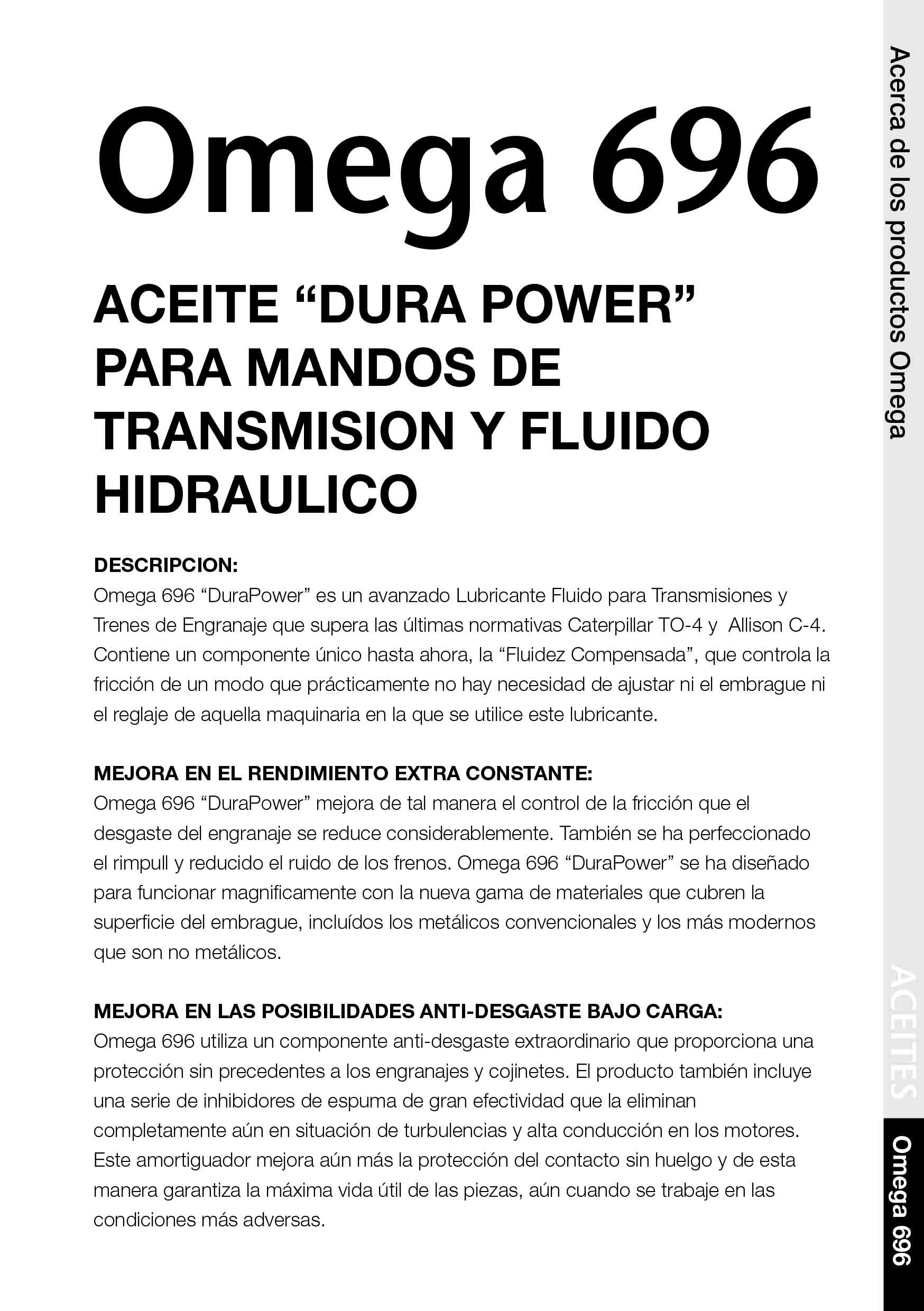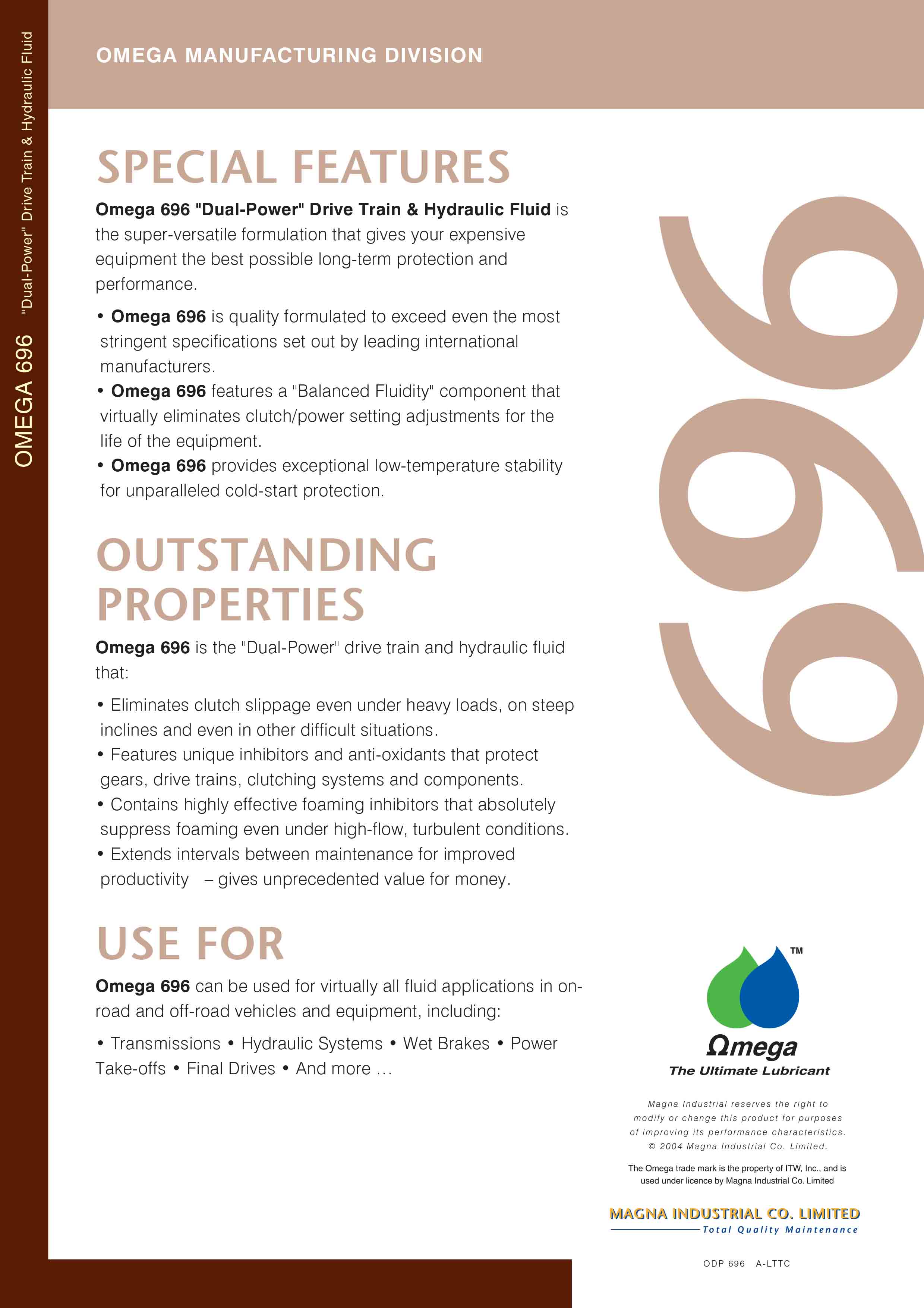 น้ำมันหล่อลื่น OMEGA 696“พลังแห่งความทนทานเป็นของเหลวหล่อลื่นสำหรับระบบส่งกำลังขั้นสุดยอด และน้ำมันขับเคลื่อนสำหรับรถไฟ ที่มีสมรรถนะสูงกว่าข้อกำหนดของ Caterpillar ฉบับล่าสุด และข้อกำหนดของ Allison C- 4 มีคุณสมบัติ ของเหลวสมดุล ที่เป็นหนึ่งเดียว ชิ้นส่วนที่ควบคุมสมรรถนะจากความเสียดทานที่กำจัดออกโดยการปรับตั้งคลัตซ์ และการตั้งกำลังของอุปกรณ์ขณะใช้งาน