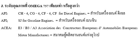 Omega 757 Long-Drain All-Fleet Engine Oil โอเมก้า 757 น้ำมันเครื่องฐานพาราฟิน ที่ให้อายุการใช้งานที่ยาวนาน ถูกผลิตด้วยส่วนผสมของ Ultra - Low Ash Megalite เหนือกว่ามาตรฐานของ GM Detroit Allison ให้การหล่อลื่นได้ถึง 50,000.00 ไมล์ หรือ ( 81,000 กิโลเมตร ) ภายใต้การทำงานที่แน่นอนเชื่อถือได้ เกรดน้ำมันพร้อมใช้ SAE 15 W 40 , 20 W 50
