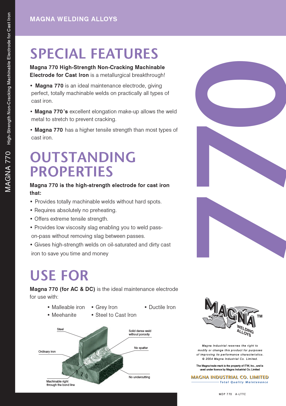 อาจจะทำการเชื่อมแบบ “เย็น” ได้โดยไม่มีการอุ่นงานหรืออาจจะทำการเชื่อมด้วยการอุ่นงานเล็กน้อยในกรณีที่เชื่อมงานที่มีความหนามาก ๆ สามารถทำการเชื่อมได้ยอดเยี่ยมในทุกท่าเชื่อมรวมทั้งท่าตั้งและท่าเหนือศีรษะเป็นลวดเชื่อมหนึ่งเดียวที่เชื่อถือได้ว่าสามารถเชื่อมโลหะที่ง่ายต่อการแตกร้าวได้และเชื่อมซ่อมวัสดุที่ถูกเพื่อใช้รับแรงดันสถิต (Hydrostatic) MAGNA 770 ไม่เพียงแต่สามารถเชื่อมเหล็กหล่อได้ทุกชนิดแล้ว แต่ยังสามารถเชื่อมเหล็กหล่อที่ความหนามาก ๆ ได้และสามารถเชื่อมเหล็กหล่อติดกับเหล็กกล้าได้ลวดเชื่อมนี้เหมาะมากในการเชื่อมที่มีความเสี่ยงต่อการเกิดโพรงก๊าซรอยแตกและสามารถเชื่อมแนวเชื่อมที่ยาว ๆ ได้โดยไม่จำเป็นต้องอุ่นงานสามารถกำจัดสแลคได้ง่ายไม่มีสะเก็ดน้ำโลหะ MAGNA 770 ยังให้แนวเชื่อมที่แน่นปราศจากรูพรุน
