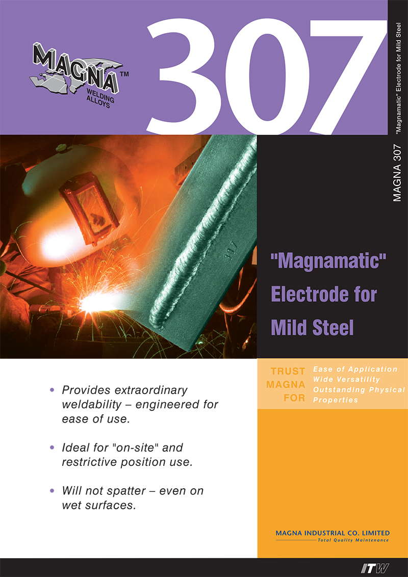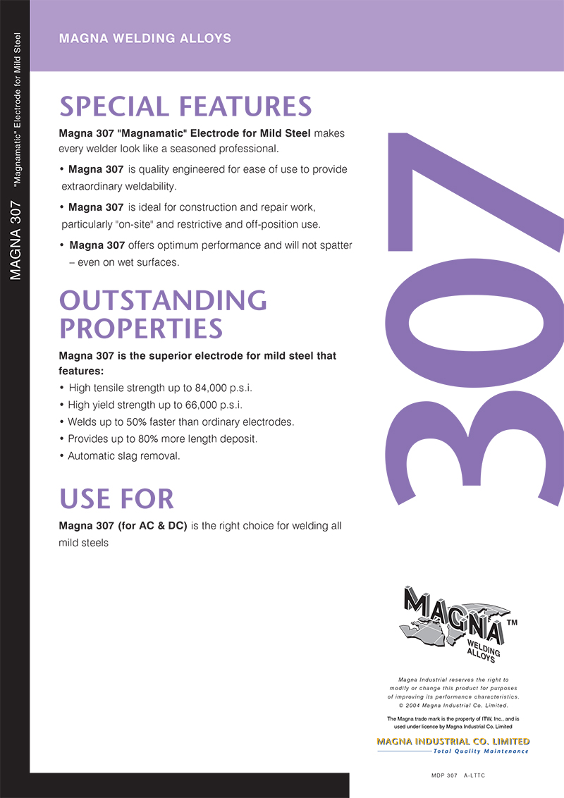 ฟลักซ์หุ้ม MAGNA 307 ประกอบไปด้วยวัสดุที่แตกตัวเป็นอิออนได้ง่ายทำให้มีความเสถียรของอาร์กที่กระแสต่ำและแรงดันวงจรเปิดที่ต่ำได้ดีกว่าสำหรับงานซ่อมบำรุงซึ่งทำให้สามารถเชื่อมงานที่บางได้และป้องกันการเกิดหลอมทะลุฟลักซ์ MAGNA 307 ทำให้เกิด “ ปฏิกิริยาเบ้าหลอม ( Crucible Action )” ที่ปลายลวดเชื่อมเพิ่มความเร็วโมเลกุลและเพิ่มความเสถียรของการอาร์กปฏิกิริยานี้ทำให้เกิดก๊าซโดยการแตกตัวของฟลักซ์หุ้มร่วมกับอิออนและไอโลหะของแกนลวดทำให้เกิดการถ่ายโอนน้ำโลหะแบบพ่นที่ละเลียดฟลักซ์นี้มีความอเนกประสงค์มากสามารถใช้เชื่อมด้วยกระแสต่ำสำหรับงานบาง ๆ ได้ลวดตัวเดียวกันนี้สามารถเชื่อมที่กระแสสูง สำหรับเหล็กหนา 6.4 มม. ที่ต่อชนชิดกันและสามารถเชื่อมโดยไม่ต้องบากร่องโดยใช้ลวด MAGNA 307 ขนาด 5/32” (4.0 มม.)