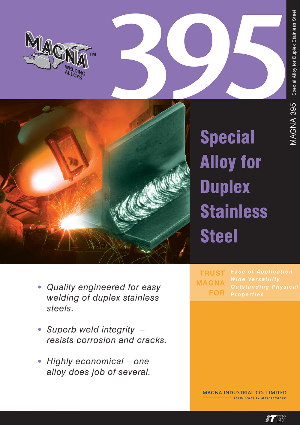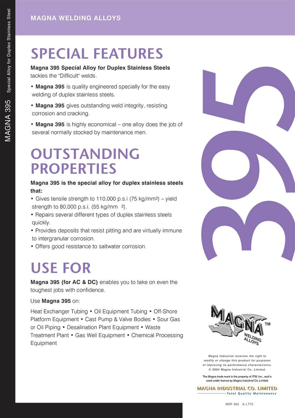 MAGNA 395 เป็นอัลลอยด์พิเศษที่ถูกออกแบบเพื่อทำการเชื่อม และซ่อมแซมบนชิ้นงานเหล็กกล้าสเตนเลสดูเพล็กซ์เพื่อรักษาความต้านทานการแตกร้าวจากการกัดกร่อนและความเค้น ( Stress Corrosion Cracking ) ต้านทานต่อการกัดกร่อนในที่อับ (Crevice Corrosion ) และการกัดกร่อนแบบเจาะ (Pitting Corrosion ) และต้านทานการกัดกร่อนตามขอบเกรน MAGNA 395 ให้การต้านทานการกัดกร่อนในน้ำเกลือและให้ความแข็งแรงที่สูงและสามารถเชื่อมง่าย