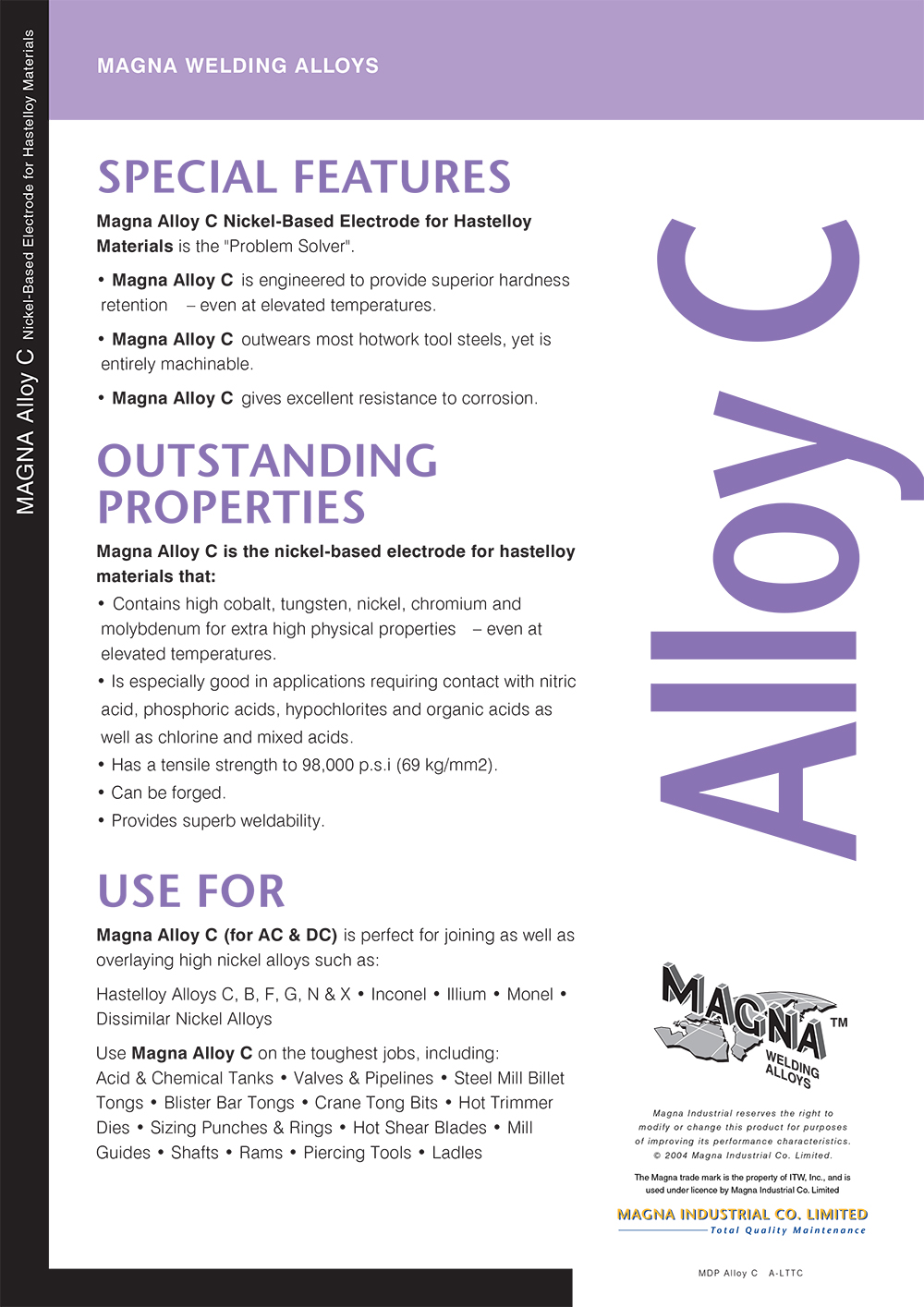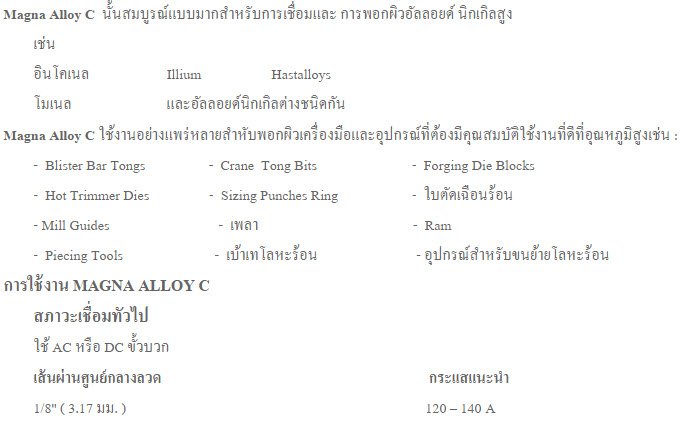 Magna Alloy C เนื้อเติมที่เป็นระบบอัลลอยดืที่ซับซ้อนปริมาณโคบอล ทังสะเตน นิกเกล โครเมียมและโมลิดินัมสูงให้คุณสมบัติทางกายภาพที่สูงที่อุณหภูมิสูงต้านทานการเสียรูปจากแรงแปรผันและแรงสถิตย์ Alloy C มีการหดตัวเล็กน้อยเมื่อเย็นตัวและขยายตัวเพียงเล็กน้อยเมื่อร้อนทนต่อความเค้นได้ดีมาก