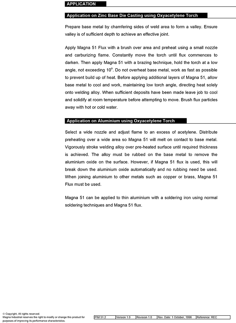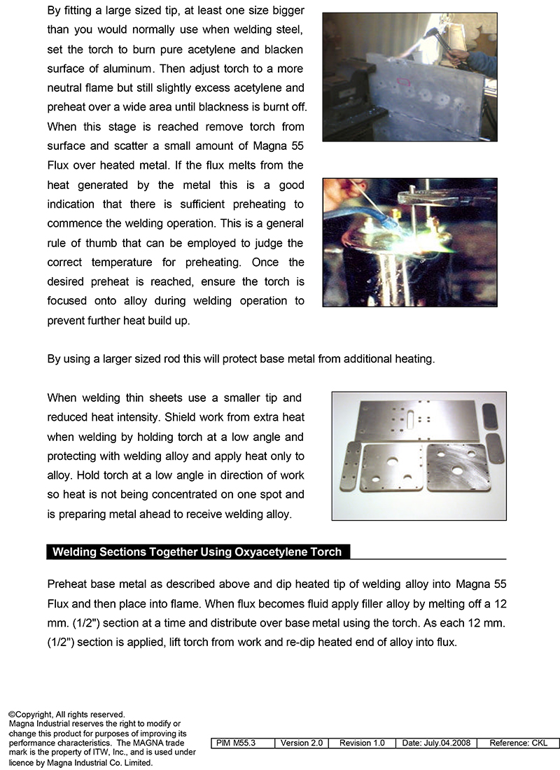 การเชื่อมด้วย MAGNA 55 ต้องใช้ร่วมกับฟลักซ์ MAGNA 55 ซึ่งถูกออกแบบให้ใช้ร่วมกับอัลลอยด์เชื่อม MAGNA 55 ฟลักซ์ที่เป็นของเหลวนี้มีช่วงอุณหภูมิหลอมละลายที่ให้ผลเหมาะสมกับลวดเชื่อมอัลลอยด์ชนิดนี้ ฟลักซ์ให้ปฏิกิริยาที่ดีมากกับโลหะที่สกปรกซึ่งมักจะเจอบ่อย ๆ ในงานซ่อมบำรุงฟลักซ์มีส่วนผสมที่ซับซ้อนมีปริมาณธาตุกึ่งมีค่า ( Semi Precious ) เช่น ลิเทียมความบริสุทธิ์สูงโลหะอื่น ๆ และสารเคมีซึ่งไม่เพียงแต่จะทำปฏิกิริยาทำความสะอาดกำจัดผิวออกไซด์เท่านั้นยังช่วยลดแรงตึงผิวและเพิ่มพลังยึดเหนี่ยวเหล่านี้ทำให้ผลลัพธ์ของการใช้ MAGNA 55 และฟลักซ์ MAGNA 55 ให้ความแข็งแรงสูงสุดต้านทานการกัดกร่อนมากที่สุดและง่ายต่อการใช้งานในอลูมิเนียมอัลลอยด์ที่สุดการอุ่นงานก่อนการเชื่อมที่โลหะฐานประมาณ 600 oF ( 316 oC ) ( ที่อุณหภูมินี้วัสดุไม้จะเริ่มเผาไหม้เป็นถ่าน เมื่อสัมผัสกับอลูมิเนียมร้อน) โดยใช้ปลายทิปหัวเชื่อมขนาดใหญ่ใส่ฟลักซ์ MAGNA 55 โดยการจุ่มปลายลวดที่ร้อนลงในถ้วยฟลักซ์และเติมฟลักซ์ลงในบริเวณที่จะเชื่อมให้ความร้อนบริเวณนั้นจนหลอมถ้าลวดหลอมไม่ติดและเป็นลูกบอลแสดงว่าโลหะฐานยังร้อนไม่เพียงพอต้องให้ความร้อนอย่างกว้าง ๆ เพื่อให้อุณหภูมิสูงขึ้นการใช้ปลายทิปที่ใหญ่กว่าในการเชื่อมเหล็กอยู่ 1 ขนาดเป็นสิ่งสำคัญมากงานหนา ๆ ควรบากร่องเป็นมุมประมาณ 60 องศาลวดเชื่อมอัลลอยด์จะถูกเติมหยดต่อหยดและแต่ละหยดจะต้องไหลไปตามหัวเชื่อมก่อนที่จะเติมหยดต่อไป แต่ละหยดน่าจะมีขนาดประมาณ ½'' ( 1.3 มม. ) ของความยาวลวดลวดเชื่อม MAGNA 55 ไม่มีรูพรุนเช่นเดียวกับที่เกิดจากลวดอลูมิเนียมทั่วไป