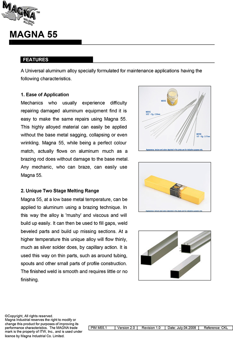 MAGNA 55 เป็นอลูมิเนียมอัลลอยด์สำหรับการใช้ในงานเชื่อมด้วยออกซิอะเซทีลีน ที่สามารถเชื่อมอลูมิเนียมได้ทุกชนิด ทั้งแบบแผ่นและหล่อ