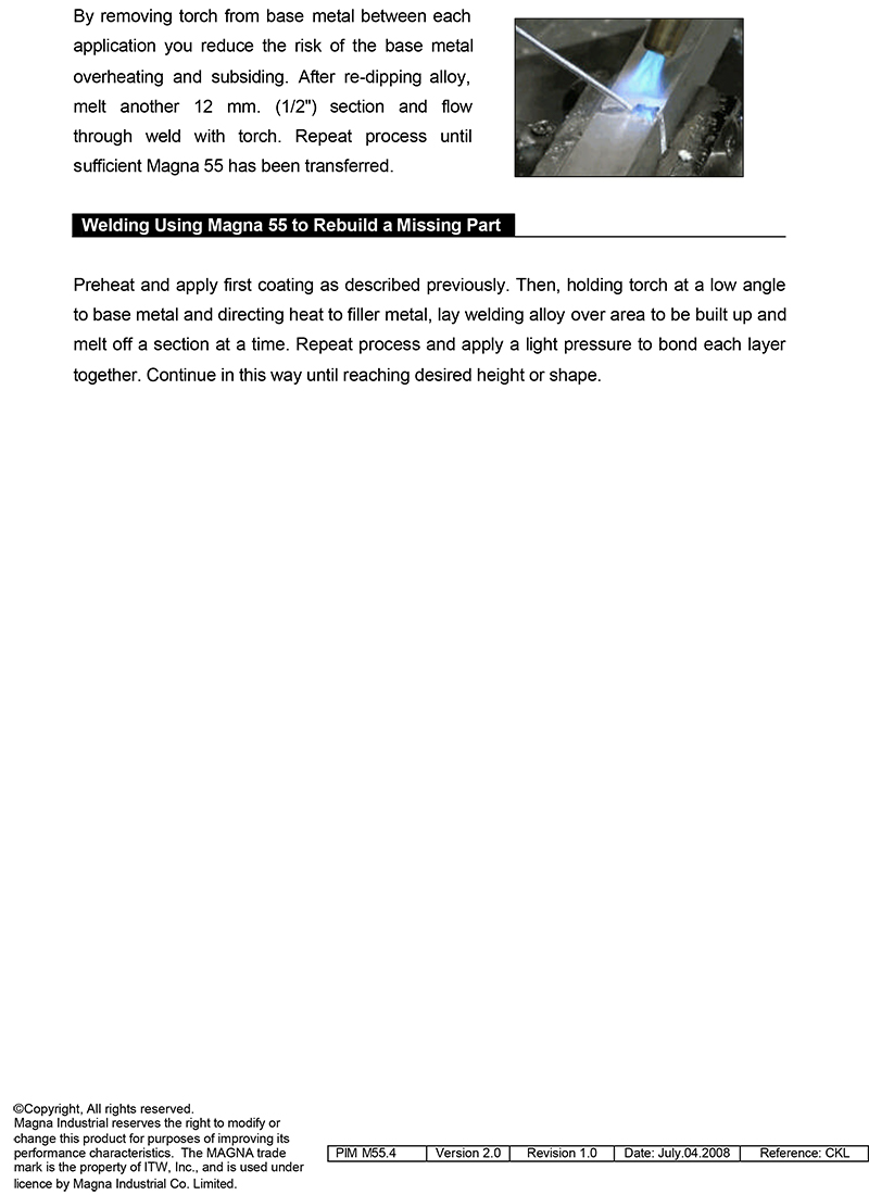 ช่างเชื่อมที่ประสบปัญหาในการเชื่อมซ่อมอุปกรณ์อลูมิเนียมที่เสียหายสามารถเชื่อมซ่อมได้อย่างง่ายดายด้วย MAGNA 55 วัสดุอัลลอยด์ผสมสูงนี้สามารถเติมลงไปในรอยเชื่อมได้โดยปราศจากการยุบตัวของโลหะฐานหรือการบิดตัว MAGNA 55 ให้สีที่ตรงกับโลหะฐานสามารถไหลบนอลูมิเนียมได้เหมือนกับลวดแล่นประสาน ( Brazing ) โดยไม่ทำอันตรายต่อโลหะฐานช่างที่สามารถทำการแล่นประสานได้ก็สามารถใช้ MAGNA 55 ได้